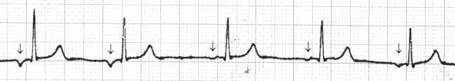 - vorzeitiger Einfall ![]() mittlere Vorhofextrasystole mit nicht kompensierender Pause (PQN = 0,20s, PQES = 0,18s) |