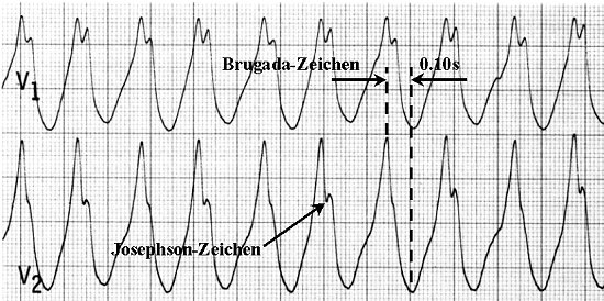 - Brugada-Zeichen: zeitlicher Abstand R-Gipfel bis S-Tal größer als 70 ms