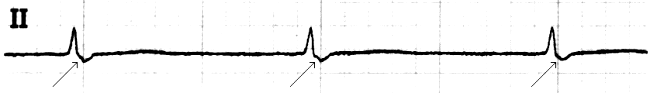 - vorzeitiger Einfall ![]() untere AV-Knoten-Extrasystole mit retrograder Vorhoferregung, geringer Aberranz und nicht kompensierender, postextrasystolischer Pause |