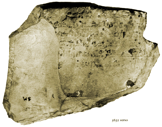 Beim Ostrakon BM 5632 handelt es sich um eine Kalksteinscherbe von 19.5cm Breite und 13.5cm Höhe. Das Ostrakon datiert aus der 19./20. Dynastie und stammt vermutlich aus Deir el-Medina. Es wurde 1834 in die Sammlung J. Sams eingekauft.