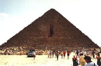 ![]() Die Mykerinos-Pyramide war an diesem Tag der Touristenschar zugänglich, während die beiden größeren Pyramiden geschlossen blieben. Wie die Skizze rechts unten zeigt, führt ein etwa 27° abschüssiger, 32m langer Gang in die Pyramide unter das Niveau des Pyramiden-Plateaus. Allerdings geht aus der Skizze nicht hervor, daß der Gang nur ca. 1,20m hoch und ca. 1m breit ist und daß sich dort die Besuchermassen im |