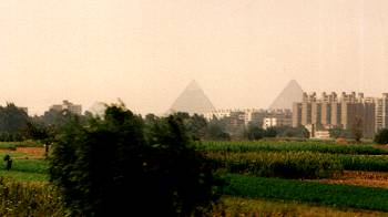 Am südwestlichen Stadtrand von Kairo befinden sich die Großen Pyramiden, die drei Herrschern der 4. Dynastie als Grabmal dienten. Auf dem Weg zum Plateau sieht man die riesigen Steinmonumente schon von weitem, eingefügt in das Stadtbild von Kairo. |