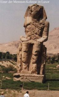 Bei einem Erdbeben 27 v.u.Z. erhielt der nördliche Memnon-Koloß Einrisse, die bei der morgendlichen Erwärmung des Steins quietschende "Klagelaute" hervorriefen. Ca. 250 Jahre später wurde die Statue restauriert und das Phänomen verschwand. |