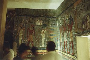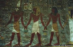Während des Besuches im Tal der Könige erhält man die Fotoerlaubnis für eines der drei geöffneten Gräber. Hier sind drei Aufnahmen aus der Grabkammer Ramses I. dargestellt, dem am schönsten geschmückten Grab (im Vergleich zu denen von Sethi II. und Sethnacht). |