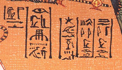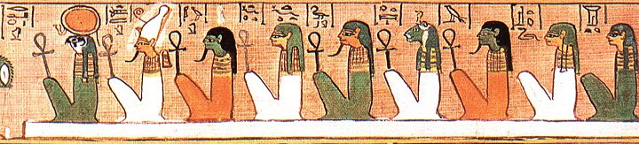 Übung: Lesen und übersetzen Sie die Namen der neun dargestellten Götter (Quelle: Totenbuch des Hunifer). Bei den abgebildeten Hieroglyphen handelt es sich nicht um ausgearbeitete, subtile Zeichen, sondern um eine einfachere, stilisierte, handgeschriebene, sog. kursive Schrift, also eine Art Schreibschrift für Hieroglyphen (Cave: nicht zu verwechseln mit dem Hieratischen oder Demotischen!).