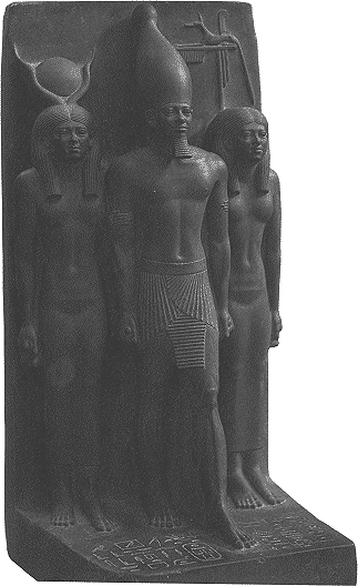 Menkaure zwischen der Göttin Hathor und der Gau-Göttin der Gegend von Samalut